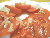 ① トマトを1cmくらいの厚さに切り、並べ、玉ねぎのみじん切りを散らす。